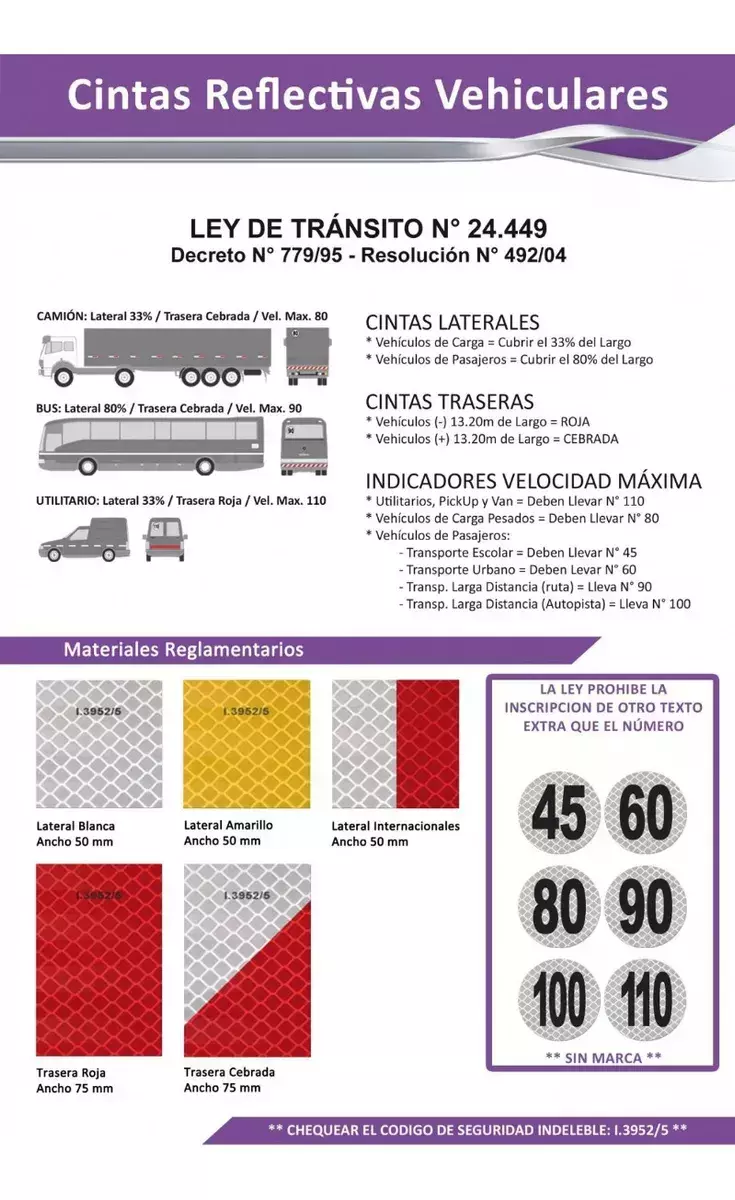 Cumplí con la ley y garantizá la seguridad de tus vehículos con esta cinta reflectiva homologada según la norma IRAM 3952/5 y la Ley Nacional Nº 24449 de Tránsito y Seguridad Vial. Especialmente diseñada para transporte de cargas, micros, ómnibus, camiones, camionetas, utilitarios y combis.